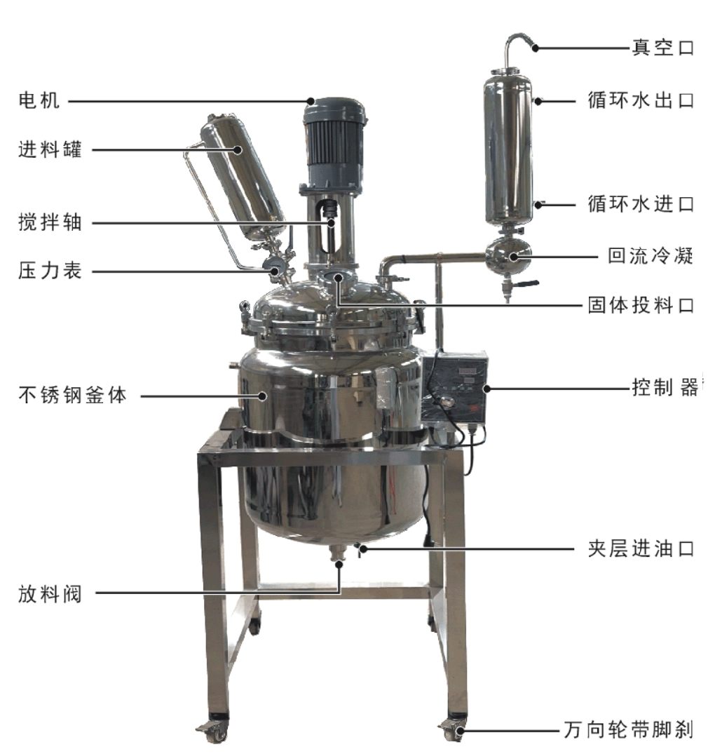 雙層不銹鋼反應(yīng)釜為雙層不銹鋼設(shè)計,內(nèi)層放入反應(yīng)溶媒可做攪拌反應(yīng),夾層通上不同的冷熱源(冷凍液,熱水或熱油)做循環(huán)加熱或冷卻反應(yīng)。在設(shè)定恒溫條件下