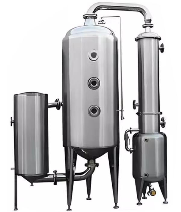 單效外循環(huán)真空濃縮器,由加熱器、蒸發(fā)器、除沫器、冷凝器、冷卻器、受液罐等組成,凡與物料接觸部件均采用優(yōu)質不銹鋼制作,本設備